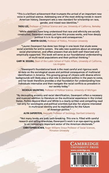 The US is transforming into a multiracial society: today one-in-six new marriages are interracial and the multiple-race population is the fastest-growing youth group in the country. In Politics Beyond Black and White, Lauren D. Davenport examines the ascendance of multiracial identities and their implications for American society and the political landscape. Amassing unprecedented evidence, this book systematically investigates how race is constructed and how it influences political behavior. Professor Davenport shows that biracials' identities are the product of family, interpersonal interactions, environment, and, most compellingly, gender stereotypes and social class. These identities, in turn, shape attitudes across a range of political issues, from affirmative action to same-sex marriage, and multiracial identifiers are shown to be culturally and politically progressive. But the book also reveals lingering prejudices against race-mixing, and that intermarriage and identification are highly correlated with economic prosperity. Overall findings suggest that multiracialism is poised to dismantle some racial boundaries, while reinforcing others.