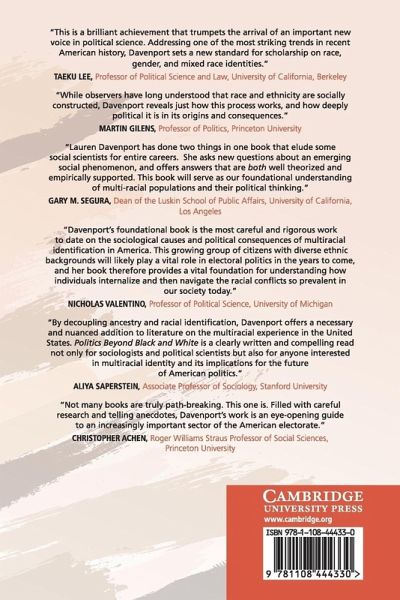 The US is transforming into a multiracial society: today one-in-six new marriages are interracial and the multiple-race population is the fastest-growing youth group in the country. In Politics Beyond Black and White, Lauren D. Davenport examines the ascendance of multiracial identities and their implications for American society and the political landscape. Amassing unprecedented evidence, this book systematically investigates how race is constructed and how it influences political behavior. Professor Davenport shows that biracials' identities are the product of family, interpersonal interactions, environment, and, most compellingly, gender stereotypes and social class. These identities, in turn, shape attitudes across a range of political issues, from affirmative action to same-sex marriage, and multiracial identifiers are shown to be culturally and politically progressive. But the book also reveals lingering prejudices against race-mixing, and that intermarriage and identification are highly correlated with economic prosperity. Overall findings suggest that multiracialism is poised to dismantle some racial boundaries, while reinforcing others.