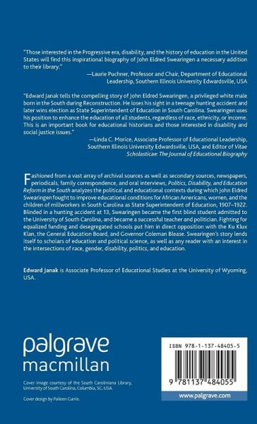 "Edward Janak tells the compelling story of John Eldred Swearingen, a privileged white male born in the South during Reconstruction. He loses his sight in a teenage hunting accident and later wins election as State Superintendent of Education in South Carolina. Swearingen uses his position to enhance the education of all students, regardless of race, ethnicity, or income. This is an important book for educational historians and those interested in disability and social justice issues." - Linda C. Morice, Associate Professor of Educational Leadership, Southern Illinois University Edwardsville, USA, and editor of Vitae Scholasticae: The Journal ofEducational Biography