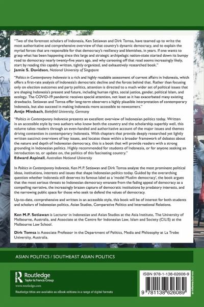 "Politics in Contemporary Indonesia is a rich and highly readable assessment of current affairs in Indonesia, which offers a first-rate analysis of Indonesia's democratic decline and the forces behind that. Rather than focusing only on election outcomes and party politics, attention is directed to a much wider set of political issues that are shaping Indonesia's present and future, including human rights, social justice, gender, political Islam, and ecology. The COVID-19 pandemic receives special attention, not least as it has exacerbated many existing drawbacks. Setiawan and Tomsa offer long-term observers a highly plausible interpretation of contemporary Indonesia, but also succeed in making Indonesia more accessible to newcomers."