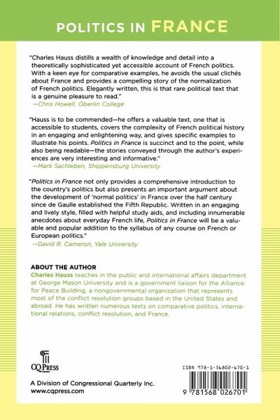 France has shifted toward more "normal" politics since the mid 1960s. That’s saying a lot for a country that has had three monarchies, five republics, two empires, and a neo-fascist regime in the years since its revolution in 1789. Hauss’s lively and up-to-date new text looks beyond "de Gaulle’s revolution," tracing France’s historical development up to the present and describing with fresh insight its political culture, parties, interest groups, and institutional system, as well as its place in the EU and the larger global economic order. Hauss offers lively analysis of recent events and issues, including the May 2007 presidential elections; hot-button policy issues like immigration and the assimilation of non-Westerners into the French cultural and political landscape and the impact of the EU on France’s economic policies. Adopt together with Politics in Britain and Politics in Germany and pass savings along to your students. For pricing and ordering information, please contact us at mailto:collegesales@cqpress.com
