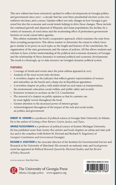 This new edition has been extensively updated to reflect developments in Georgia politics and government since 2007--a decade that has seen three presidential election cycles, two midterm elections, and a census. Updates reflect not only changes in how Georgia is governed but also the economic and social trends helping to drive those changes. These include the continued growth and dispersal of His panic and Asian populations; the decline, by a variety of measures, of rural areas; and the moderating effect of probusiness government factions on social conservative agendas. This edition maintains the book's comparative approach, which examines the state from three revealing perspectives. This allows readers to determine the extent to which Georgia is similar to its peers on such topics as the length and features of the constitution, the organization of the state government, and the nature of policies. All this allows students and scholars to have a better understanding of the political and economic dynamics of Georgia and the relationship of those dynamics to national political and economic developments. The result is a thorough, up-to-date resource on Georgia's dynamic political system. Features: -Coverage of trends and events since the prior edition appeared in 2007 -Analysis of the most recent state elections -A rewritten chapter on the judiciary that reflects greater representation of women and minorities on the bench and a sharp rise in Republican appointees -A rewritten chapter on policy, with added detail on such topics as transportation, the environment, education, social welfare, and public safety and security -Extensive revisions to sections on the U.S. Constitution -The removal of a chapter on public opinion so that its contents can be more tightly woven throughout the book -Greater attention to the increased power of interest groups -Acknowledgment throughout of the impact of the web and social media in politics and government