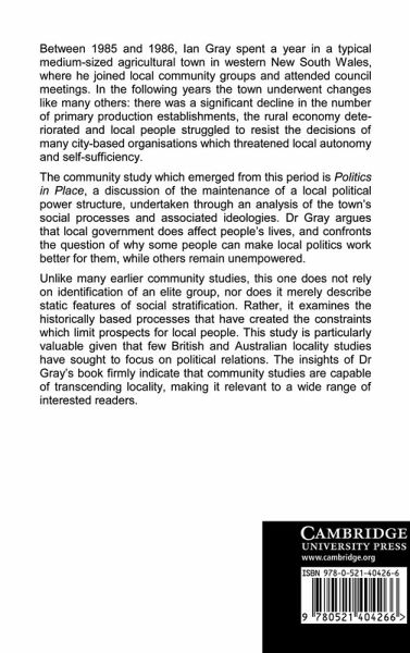 Politics in Place is a community study focusing on political life in a typical Australian agricultural town.