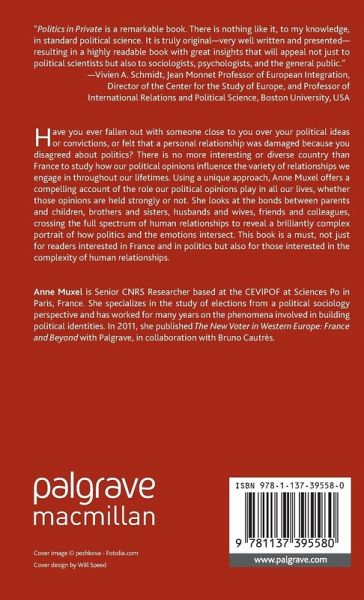 Have you ever fallen out with someone close to you over your political ideas or convictions or felt that a personal relationship was damaged because you disagreed about politics? There is no more interesting or diverse country than France to study how our political opinions influence the variety of relationships we engage in throughout our lifetimes. Using a unique approach, Anne Muxel offers a compelling account of the role our political opinions play in all our lives, whether those opinions are held strongly or not. She looks at the bonds between parents and children, brothers and sisters, husbands and wives, friends and colleagues, crossing the full spectrum of human relationships to reveal a brilliantly complex portrait of how politics and the emotions intersect. This book is a must, not just for readers interested in France and in politics but also for all those interested in the complexity of human relationships.