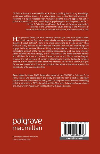 Have you ever fallen out with someone close to you over your political ideas or convictions or felt that a personal relationship was damaged because you disagreed about politics? There is no more interesting or diverse country than France to study how our political opinions influence the variety of relationships we engage in throughout our lifetimes. Using a unique approach, Anne Muxel offers a compelling account of the role our political opinions play in all our lives, whether those opinions are held strongly or not. She looks at the bonds between parents and children, brothers and sisters, husbands and wives, friends and colleagues, crossing the full spectrum of human relationships to reveal a brilliantly complex portrait of how politics and the emotions intersect. This book is a must, not just for readers interested in France and in politics but also for all those interested in the complexity of human relationships.