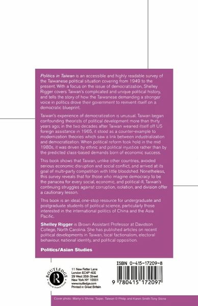 This book shows that Taiwan, unlike other countries, avoided serious economic disruption and social conflict, and arrived at its goal of multi-party competition with little blood shed. Nonetheless, this survey reveals that for those who imagine democracy to be the panacea for every social, economic and political ill, Taiwan's continuing struggles against corruption, isolation and division offer a cautionary lesson. This book is an ideal, one-stop resource for undergraduate and postgraduate students of political science, particuarly those interested in the international politics of China, and the Asia-Pacific.
