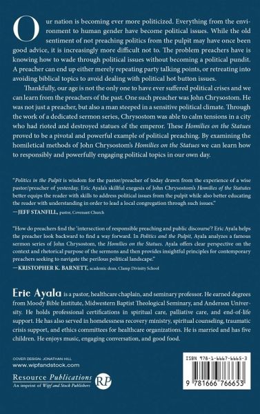 Our nation is becoming ever more politicized. Everything from the environment to human gender have become political issues. While the old sentiment of not preaching politics from the pulpit may have once been good advice, it is increasingly more difficult not to. The problem preachers have is knowing how to wade through political issues without becoming a political pundit. A preacher can end up either merely repeating party talking points, or retreating into avoiding biblical topics to avoid dealing with political hot button issues. Thankfully, our age is not the only one to have ever suffered political crises and we can learn from the preachers of the past. One such preacher was John Chrysostom. He was not just a preacher, but also a man steeped in a sensitive political climate. Through the work of a dedicated sermon series, Chrysostom was able to calm tensions in a city who had rioted and destroyed statues of the emperor. These Homilies on the Statues proved to be a pivotal and powerful example of political preaching. By examining the homiletical methods of John Chrysostom's Homilies on the Statues we can learn how to responsibly and powerfully engaging political topics in our own day.