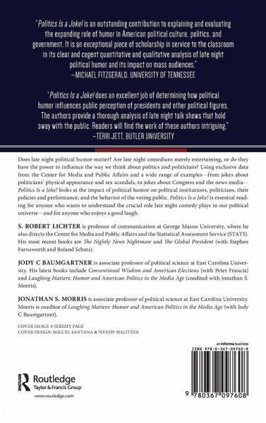 Does late night political humor matter? Are late-night comedians merely entertaining, or do they have the power to influence the way we think about politics and politicians? Politics Is a Joke! situates late night comedy in the historical context of political humor and demonstrates how the public turn to this venue for political information, and are in turn affected by it.Using exclusive data collected by the Center for Media and Public Affairs, the authors conduct a detailed and exhaustive analysis of political jokes on late night TV shows dating back to 1992 in order to pinpoint the main targets and themes of late-night comedy. Politics Is a Joke! uses a wide range of examples, from jokes about politicians' physical appearance and sex scandals to jokes about Congress and even the news media, to assess and understand the impact of political humor on political institutions, politicians and their policies and behavior.Engagingly written with analysis of jokes from comedians like Jay Leno, Conan O'Brien, Jon Stewart and Stephen Colbert, Politics is a Joke! is essential reading for anyone who wants to understand the crucial role late night comedy plays in our political universe - and anyone who enjoys a good laugh.