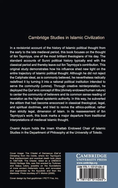 This revisionist account of the history of Islamic political thought from the early to the late medieval period focuses on Ibn Taymiyya, one of the most brilliant theologians of his day. This original study demonstrates how his influence shed new light on the entire trajectory of Islamic political thought. Although he did not reject the Caliphate ideal, as is commonly believed, he nevertheless radically redefined it by turning it into a rational political institution intended to serve the community (umma). Through creative reinterpretation, he deployed the Qur'anic concept of fitra (divinely endowed human nature) to centre the community of believers and its common-sense reading of revelation as the highest epistemic authority. In this way, he subverted the elitism that had become ensconced in classical theological, legal and spiritual doctrines, and tried to revive the ethico-political, rather than strictly legal, dimension of Islam. In reassessing Ibn Taymiyya's work, this book marks a major departure from traditional interpretations of medieval Islamic thought.