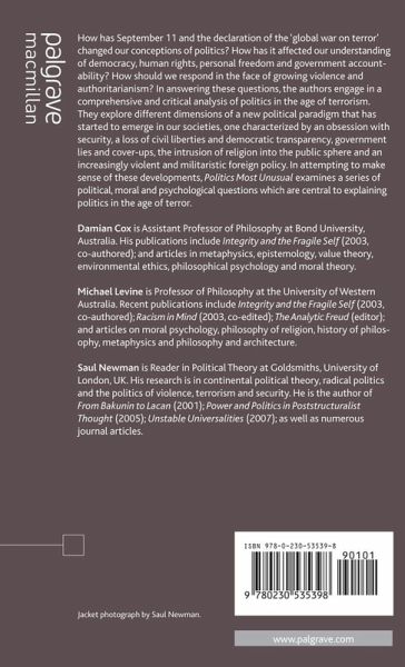 'Politics Most Unusual is a significant contribution to the substantial literature taking a broadly 'critical' perspective on the nature of post-9/11 politics. Its key strength is the engagement with a psychoanalytic approach to understanding the nature and significance of neglected aspects of religion and prejudice in contemporary political life and the ways in which 'spin', dissimulation and straightforward lying have ceased to be the mortal sins of politics that they once were. The authors deserve credit for this significant contribution to debate in this field.' John Williams, Contemporary Political Theory