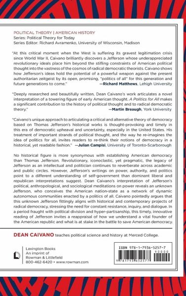 In this heterodox reading of Thomas Jefferson, Dean Caivano proposes a theory of democracy conceived through a politics of all. Democracy from this standpoint does not entail liberal consensus-building but rejects hierarchical forms of authority, supplanted by ongoing political resistance by "the people" to obtain freedom and equality.