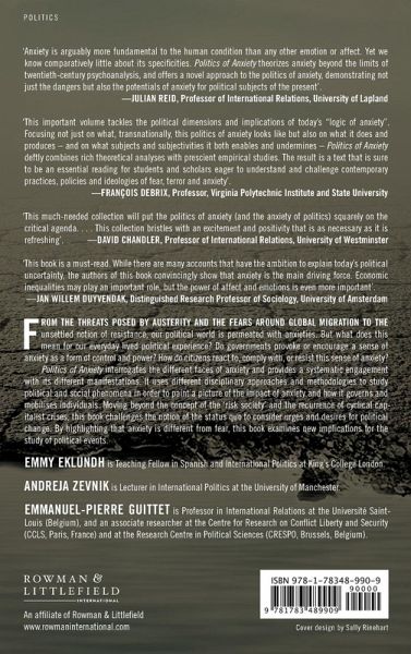 1. Introduction: Politics of Anxiety, Emmy Eklundh, Emmanuel-Pierre Guittet and Andreja Zevnik Part I: Politicizing Anxiety 2. For want of not: Lacan's conception of anxiety, J. Peter Burgess 3. When does Repression become Political?, Henrique Tavares Furtado Part II: Security: Control 4. Anxiety: Trauma: Resilience, Mark Neocleous 5. The New Age of Suspicion, Emmanuel-Pierre Guittet and Fabienne Brion 6. The Effects of Uncertainty: Anxiety and Crisis Preparedness, Carsten Baran Part III: Resistance: Reclaiming 7. The Politics of Anxiety and the Rise of Far-Right Parties in Europe, Norma Rossi 8. Indignation as resistance: Beyond the Anxiety of No Future Alternatives, Paolo Cossarini 9. Neurotic Neoliberalism and the Economics of Anxiety, Japhy Wilson Part IV: Epilogue 10. Sovereign Anxiety and Baroque Politics, Michael Dillon