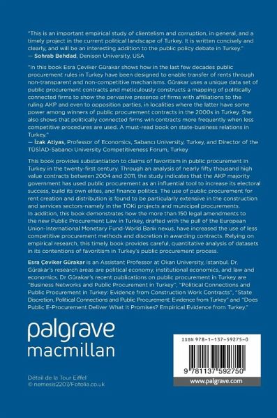 This book, through an analysis of 49,355 high value public procurement contracts awarded between 2004 and 2011, provides systematic evidence on favoritism in public procurement in Turkey. Public procurement is one of the main areas where the government and the private sector interact extensively and is thus open to favoritism and corruption. In Turkey, the new Public Procurement Law, which was drafted with the pull of the EU-IMF-WB nexus, has been amended more than 150 times by the AKP government. In addition to examining favoritism, this book also demonstrates how the legal amendments have increased the use of less competitive procurement methods and discretion in awarding contracts. The results reveal that the AKP majority government has used public procurement as an influential tool both to increase its electoral success, build its own elites and finance politics. The use of public procurement for rent creation and distribution is found to be particularly extensive in the construction and the services sector through the TOKI projects and the Municipal procurements.