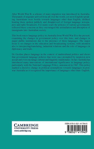 This 1993 book traces language policy in Australia from World War II to the present, examining the changes in government policy over this time, and changes in major public institutions due to the presence of these languages. The major focus is on changes in the education and broadcasting systems, with attention also to interpreting/translating, industrial relations and the role of languages in diplomacy and trade. Dr Ozolins places language in the context of multicultural politics and shows that government language policies that were once prompted by suspicion now accept and even encourage cultural and linguistic maintenance. In fact Australia has introduced many innovations of international significance in language policy, particularly with the National Language Policy, announced in 1987. This policy marked a decisive change in political assumptions towards languages in post-war Australia as it recognised the importance of languages other than English.