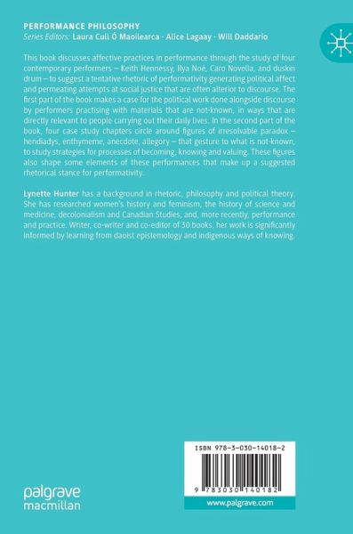 This book discusses affective practices in performance through the study of four contemporary performers - Keith Hennessy, Ilya Noé, Caro Novella, and duskin drum - to suggest a tentative rhetoric of performativity generating political affect and permeating attempts at social justice that are often alterior to discourse. The first part of the book makes a case for the political work done alongside discourse by performers practising with materials that are not-known, in ways that are directly relevant to people carrying out their daily lives. In the second part of the book, four case study chapters circle around figures of irresolvable paradox - hendiadys, enthymeme, anecdote, allegory - that gesture to what is not-known, to study strategies for processes of becoming, knowing and valuing. These figures also shape some elements of these performances that make up a suggested rhetorical stance for performativity.