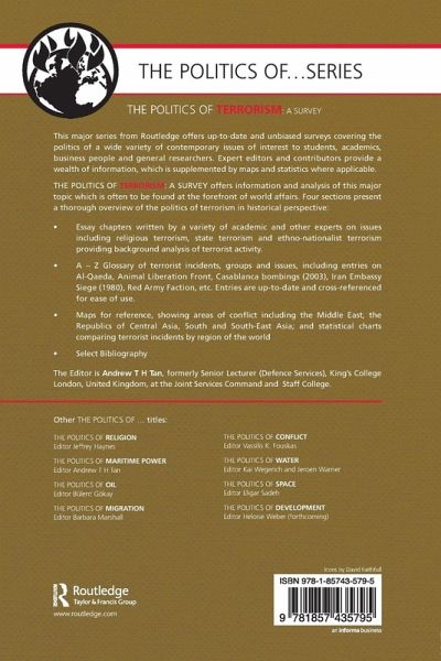 Terrorism is increasingly at the forefront of political agendas. Events world-wide have led to an increased awareness and response to this global phenomenon. The focus of this volume is on examining the fundamental causes of alienation and rebellion that underlie the use of terrorism as an instrument of violence. This title includes: essays, each of around 8,000 words in length, providing in-depth analysis of topics of relevance in the subject an A-Z glossary of key terrorist groups and organizations, as well as major terrorist incidences and events detailed maps and statistics an extensive bibliography listing further relevant reading material. This unique combination of analytically detailed essays with statistics and a glossary make this title a unique one-stop reference source as well as a training and education guide on the politics of terrorism world-wide.