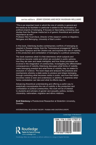 The book examines what it is that determines which subjects and narratives become visible and which are occluded in public spheres; how they are seen and made intelligible; and how those processes are involved in the imagination of communities. Investigating the differentiated consequences of visibility, Edenborg discusses what forms of visibility make belonging possible and what forms of visibility may be related to exclusion or violence. The book maps and analyses the practices and mechanisms whereby a state seeks to produce and shape belonging through controlling what becomes visible in public, and how that which becomes visible is seen and understood. In addition, it examines what forms contestation can take and what its effects may be.