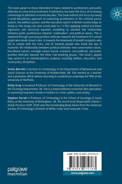 This book speaks to those interested in topics related to punitiveness and public attitudes to crime and punishment. Punitiveness has been the focus of increasing criminological attention in recent decades. This book extends this focus by taking a multi-disciplinary approach to examining punitiveness in the criminal justice system, the welfare system, and the education system in British society today. In doing so, this study uses new survey data (n=5,781) applying ordinal and linear regression and structural equation modelling to examine the relationship between public punitiveness towards 'rulebreakers' and political values. This is explored through assessing punitive attitudes towards the treatment of i) school pupils who break school rules, ii) towards the treatment of benefit recipients who fail to comply with the rules, and iii) towards people who break the law. It examines the relationship between political attitudes (neo-conservative values, neo-liberal values), nostalgic values (social, economic, and political), and public punitive attitudes towards the three rule-breaking groups. This book's appeal may extend to an interdisciplinary audience including welfare, education, and social policy disciplines.