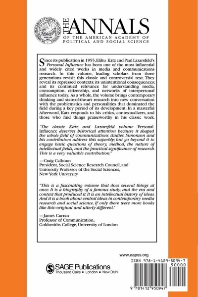 When the controversial book, Personal Influence: The Part Played by People in the Flow of Mass Communications, was published in 1955, it made waves across the fields of communications, public opinion research, political science, and marketing. Written by Elihu Katz and Paul Lazarsfeld, Personal Influence became the canonical statement of the "two-step flow" of communication, which posits that mass media flow to "opinion leaders," who in turn influence the behavior and opinions of people around them. Throughout the last half of a century, Personal Influence has undergone rigorous critique, appeared in numerous citations, and become a key text in the history of mass communications. Why is a rereading of this text relevant now? Upon the 50th anniversary of the publishing of Personal Influence, the editors of this volume of The ANNALS believed it was an ideal time to reflect upon the book's mid-century contexts and contemporary drawing upon enrichments of the field provided by feminism, critical and cultural studies, the new historicism, and progress in the social sciences. This unique volume of The ANNALS crosses generational, disciplinary, and national boundaries to piece together and pull apart a historically important text and use it to shed light on the contemporary environment. Essays in this volume analyze the personalities who played key roles in the making of Personal Influence, their origins and social identities, the institutional organization of research in which it evolved, and the disciplinary consequences of its success. Other authors reread Katz and Lazarfeld's classic as a way to explore the relations between citizenship and consumption, the nature of media and political involvement today, and the relevance of the two-step flow paradigm for the study of contemporary audiences, social networks, and public campaigns. A must-read for scholars, students, and professionals in the fields of communication, public opinion, political science, sociology, and marketing, this volume of The ANNALS dusts off a time-worn text and renews its significance in the field of mass communications with modern scholarly perspectives and contemporary methodology experience, inspiring a fresh outlook on this historical force.