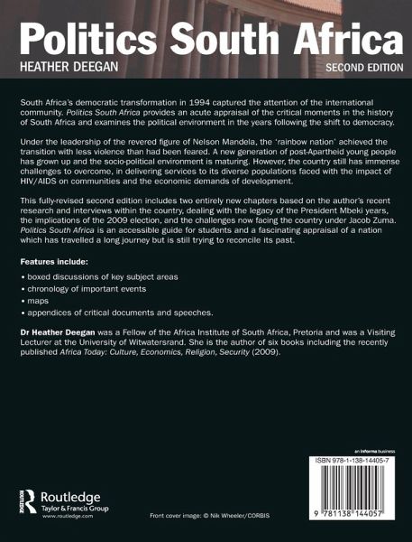 South Africa's democratic transformation in 1994 captured the attention of the international community. "Politics: South Africa "provides an acute appraisal of the critical moments in the history of South Africa and examines the political environment in the years following the shift to democracy. Under the leadership of the revered figure of Nelson Mandela, the 'rainbow nation' achieved the transition with less violence than had been feared. A new generation of post-Apartheid young people has grown up and the socio-political environment is maturing. However, the country still has immense challenges to overcome, in delivering services to its diverse populations faced with the impact of HIV/AIDS on communities and the economic demands of development. This fully-revised second edition includes two entirely new chapters based on the author's recent research and interviews within the country, dealing with the legacy of the President Mbeki years, the implications of the 2009 election, and the challenges now facing the country under Jacob Zuma. "Politics: South Africa "is an accessible guide for students and a fascinating appraisal of a nation which has travelled a long journey but is still trying to reconcile its past. Features include: * boxed discussions of key subject areas * chronology of important events * maps * appendices of critical documents and speeches Dr Heather Deegan is a Reader in Comparative Politics at Middlesex University, London. She was a Fellow of the Africa Institute of South Africa, Pretoria and was a Visiting Lecturer at the University of Witwatersrand. She is the author of six books including the recently published "Africa Today: Culture, Economics, Religion, Security" (2009).