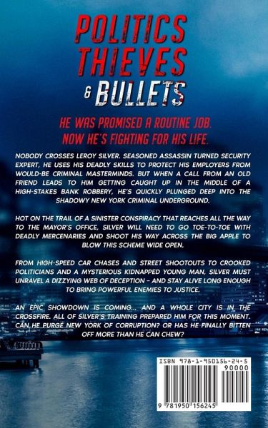 He was promised a routine job. Now he's fighting for his life. Nobody crosses Leroy Silver. Seasoned assassin turned security expert, he uses his deadly skills to protect his employers from would-be criminal masterminds. But when a call from an old friend leads to him getting caught up in the middle of a high-stakes bank robbery, he's quickly plunged deep into the shadowy New York criminal underground. Hot on the trail of a sinister conspiracy that reaches all the way to the mayor's office, Silver will need to go toe-to-toe with deadly mercenaries and shoot his way across the Big Apple to blow this scheme wide open. From high-speed car chases and street shootouts to crooked politicians and a mysterious kidnapped young man, Silver must unravel a dizzying web of deception - and stay alive long enough to bring powerful enemies to justice. An epic showdown is coming... and a whole city is in the crossfire. All of Silver's training prepared him for this moment. Can he purge New York of corruption? Or has he finally bitten off more than he can chew? Leroy Silver is back in the game - and he's out for blood. With all the exhilarating thrills and explosive suspense of a classic action motive, Politics Thieves & Bullets is a wild fast-paced ride that will delight fans of authors including Lee Childs and Mark Greaney.