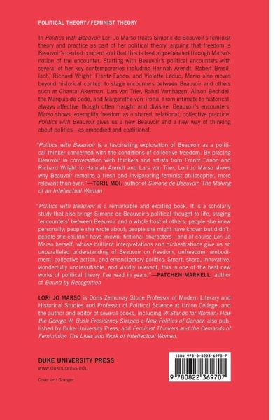 In Politics with Beauvoir Lori Jo Marso treats Simone de Beauvoir's feminist theory and practice as part of her political theory, arguing that freedom is Beauvoir's central concern and that this is best apprehended through Marso's notion of the encounter. Starting with Beauvoir's political encounters with several of her key contemporaries including Hannah Arendt, Robert Brasillach, Richard Wright, Frantz Fanon, and Violette Leduc, Marso also moves beyond historical context to stage encounters between Beauvoir and others such as Chantal Akerman, Lars von Trier, Rahel Varnhagen, Alison Bechdel, the Marquis de Sade, and Margarethe von Trotta. From intimate to historical, always affective though often fraught and divisive, Beauvoir's encounters, Marso shows, exemplify freedom as a shared, relational, collective practice. Politics with Beauvoir gives us a new Beauvoir and a new way of thinking about politics-as embodied and coalitional.