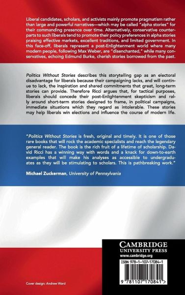 Liberal candidates, scholars, and activists mainly promote pragmatism rather than large and powerful narratives - which may be called 'alpha stories' for their commanding presence over time. Alternatively, conservative counterparts to such liberals tend to promote their policy preferences in alpha stories praising effective markets, excellent traditions, and limited government. In this face-off, liberals represent a post-Enlightenment world where many modern people, following Max Weber, are 'disenchanted', while many conservatives, echoing Edmund Burke, cherish stories borrowed from the past. Politics without Stories describes this storytelling gap as an electoral disadvantage for liberals because their campaigning lacks, and will continue to lack, the inspiration and shared commitments that great, long-term stories can provide. Therefore, Ricci argues that, for tactical purposes, liberals should concede their post-Enlightenment skepticism and rally around short-term stories designed to frame, in political campaigns, immediate situations which they regard as intolerable. These may help liberals win elections and influence the course of modern life.