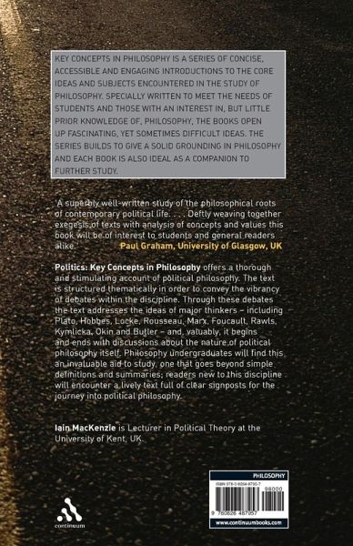 The extent and nature of rights; the sources of state power; the promises and pitfalls of democracy; how to achieve a just distribution of social goods; the claims of culture and gender on our identity: these are just some of the issues to have been addressed by political philosophers throughout history. Politics: Key Concepts in Philosophy offers a thorough and stimulating account of political philosophy. The text is structured thematically in order to convey the vibrancy of debates within the discipline. Through these debates the text addresses the ideas of major thinkers - including Plato, Hobbes, Locke, Rousseau, Marx, Foucault, Rawls, Kymlicka, Okin and Butler - and it begins and ends with discussions about the nature of political philosophy itself. This is an invaluable aid to study, one that goes beyond simple definitions and summaries; readers new to this discipline will encounter a lively text full of clear signposts for the journey into political philosophy.