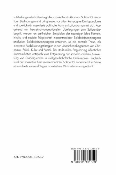 In Mediengesellschaften folgt die soziale Konstruktion von Solidarität neuartigen Bedingungen und bringt neue, vor allem kampagnenförmig geplante und spektakulär inszenierte politische Kommunikationsformen mit sich. Ausgehend von theoretisch-konzeptionellen Überlegungen zum Solidaritätsbegriff, werden an zahlreichen Beispielen der neunziger Jahre Formen, Inhalte und soziale Trägerschaft massenmedialer Solidaritätskampagnen analysiert. Solidaritätskampagnen entstehen, so die zentrale These, als innovative Mobilisierungsstrategien in den Überschneidungszonen von Ökonomie, Politik, Kultur und Moral. Der strukturellen Entgrenzung öffentlicher Kommunikation entspricht eine Entgrenzung der sozial-räumlichen Ausweitung von Solidargrenzen in weltgesellschaftliche Dimensionen. Zugleich wird der normative Kern massenmedialer Solidarität zunehmend im Sinne eines allseits konsensfähigen Minimalismus ausgedünnt.