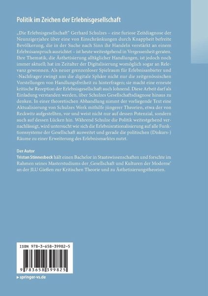 "Die Erlebnisgesellschaft" Gerhard Schulzes - eine furiose Zeitdiagnose der Neunzigerjahre über eine von Einschränkungen durch Knappheit befreite Bevölkerung, die in der Suche nach Sinn ihr Handeln verstärkt an einem Erlebnisanspruch ausrichtet - ist heute weitestgehend in Vergessenheit geraten. Ihre Thematik, die Ästhetisierung alltäglicher Handlungen, ist jedoch noch immer aktuell; hat im Zeitalter der Digitalisierung womöglich sogar an Relevanz gewonnen. Als neuer grenzenloser Spielraum für Erlebnisanbieter und -Nachfrager zwingt uns die digitale Sphäre nicht nur die zeitgenössischen Vorstellungen von Handlungsfreiheit zu hinterfragen; sie macht eine erneute kritische Rezeption der Erlebnisgesellschaft auch lohnend. Diese Arbeit darf als Einladung verstanden werden, über Schulzes Gesellschaftsdiagnose hinaus zu denken. In einer theoretischen Abhandlung nimmt der vorliegende Text eine Aktualisierung von Schulzes Werk mithilfe jüngerer Theorien, etwa der von Reckwitz aufgestellten,vor und weist nicht nur auf dessen Potenzial, sondern auch auf dessen Lücken hin. Während Schulze die Politik weitestgehend vernachlässigt, wird untersucht wie sich die Erlebnisrationalisierung auf alle Funktionssysteme der Gesellschaft ausweitet und gerade die politischen (Diskurs-)Räume zu einer Erweiterung des Erlebnismarktes nutzt.