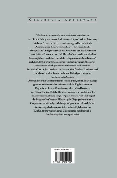Wie kommt es innerhalb eines territorium non clausum zur Herausbildung konfessioneller Homogenität, und welche Bedeutung hat dieser Prozeß für die Territorialisierung und herrschaftliche Durchdringung dieses Gebietes? Die vorderösterreichische Markgrafschaft Burgau war solch ein Territorium mit hochkomplexen Herrschaftsstrukturen, in dem sich Herrschaftsrechte der katholischen habsburgischen Landesherren und der teils protestantischen "Insassen" und "Begüterten" in unterschiedlichen Ausprägungen und Mischungsverhältnissen überlagerten und miteinander konkurrierten. Im Verlauf des 16. Jahrhunderts und bis zum Westfälischen Friedenschluß fand dieses Gebilde dann zu nahezu vollständiger homogener konfessioneller Gestalt. Dietmar Schiersner unternimmt es in seinem Buch, diesen Entwicklungsgang im einzelnen nachzuzeichnen und das Ergebnis in seiner Tragweite zu deuten: Zum einen werden anhand konkreter konfessioneller Konfliktfälle Handlungsmuster und -spielräume der konkurrierenden Akteure ausgelotet; zum anderen wird am Beispiel des burgauischen Vorortes Günzburg die Gegenprobe an einem Ort genommen, der aufgrund einer günstigen herrschaftsrechtlichen Ausstattung oder besonderer informeller Möglichkeiten der Einflußnahme weitergehende Zielsetzungen habsburgischer Konfessionspolitik prinzipiell zuließ.