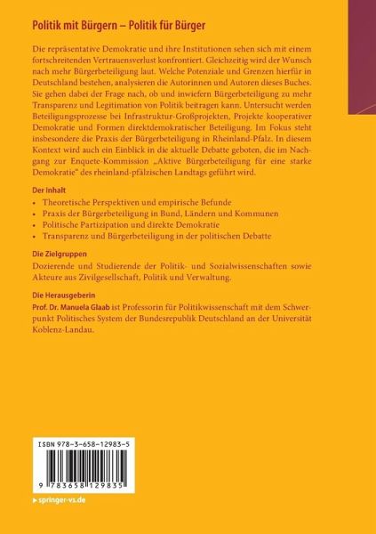 Die repräsentative Demokratie und ihre Institutionen sehen sich mit einem fortschreitenden Vertrauensverlust konfrontiert. Gleichzeitig wird der Wunsch nach mehr Bürgerbeteiligung laut. Welche Potenziale und Grenzen hierfür in Deutschland bestehen, analysieren die Autorinnen und Autoren dieses Buches. Sie gehen dabei der Frage nach, ob und inwiefern Bürgerbeteiligung zu mehr Transparenz und Legitimation von Politik beitragen kann. Untersucht werden Beteiligungsprozesse bei Infrastruktur-Großprojekten, Projekte kooperativer Demokratie und Formen direktdemokratischer Beteiligung. Im Fokus steht insbesondere die Praxis der Bürgerbeteiligung in Rheinland-Pfalz. In diesem Kontext wird auch ein Einblick in die aktuelle Debatte geboten, die im Nachgang zur Enquete-Kommission "Aktive Bürgerbeteiligung für eine starke Demokratie" des rheinland-pfälzischen Landtags geführt wird.