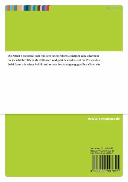 Studienarbeit aus dem Jahr 2001 im Fachbereich Südasienkunde, Südostasienkunde, Note: 3, Ruhr-Universität Bochum, Sprache: Deutsch, Abstract: Die Arbeit beschäftigt sich mit dem Tibetproblem, zeichnet ganz allgemein die Geschichte Tibets ab 1950 nach und geht besonders auf die Person des Dalai Lama mit seiner Politik und seinen Forderungen gegenüber China ein.
