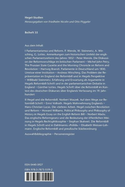 Christoph Jamme. Einleitung I Parlamentarismus und Reform. P.¿Wende, W.¿Steinmetz, A.¿Wirsching, G.¿Lottes. Anmerkungen zum historischen Umfeld der englischen Parlamentsreform des Jahres 1832 ¿ Peter Wende. Die Diskussion der Reformvorschläge im britischen Parlament ¿ Michel John Petry. The Prussian State Gazette and the Morning Chronicle on Reform and Revolution ¿ Hartwig Brandt. Parlamente in Deutschland um 1830. Umrisse einer Institution ¿ Andreas Wirsching. Das Problem der Repräsentation im England der Reformbill und in Hegels Perspektive ¿ Willibald Steinmetz. Erfahrung und Erwartung als Argumente in Hegels Reformbill-Schrift und in der parlamentarischen Debatte in England ¿ Günther Lottes. Hegels Schrift über die Reformbill im Kontext des deutschen Diskurses über Englands Verfassung im 19. Jahrhundert II Hegel und die Reformbill. Norbert Waszek. Auf dem Wege zur Reformbill-Schrift ¿ Ernst Vollrath. Hegels Wahrnehmung Englands ¿ Hans-Christian Lucas. Die »tiefere« Arbeit. Hegel zwischen Revolution und Reform ¿ Howard Williams. Political Philosophy and Philosophy of History in Hegels Essay on the English Reform Bill ¿ Norbert Madu. Das englische Reformgesetz und die Bedeutung der öffentlichen Meinung in Hegels Rechtsphilosophie ¿ Stephan Skalweit. Die Reformbill in Hegels Schrift und in Dahlmanns »Politik« ¿ Elisabeth Weisser-Lohmann. Englische Reformbill und preußische Städteordnung Auswahlbibliographie ¿ Personenregister