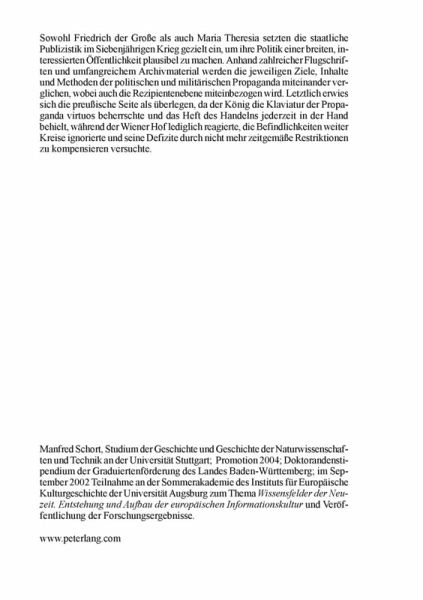Sowohl Friedrich der Große als auch Maria Theresia setzten die staatliche Publizistik im Siebenjährigen Krieg gezielt ein, um ihre Politik einer breiten, interessierten Öffentlichkeit plausibel zu machen. Anhand zahlreicher Flugschriften und umfangreichem Archivmaterial werden die jeweiligen Ziele, Inhalte und Methoden der politischen und militärischen Propaganda miteinander verglichen, wobei auch die Rezipientenebene miteinbezogen wird. Letztlich erwies sich die preußische Seite als überlegen, da der König die Klaviatur der Propaganda virtuos beherrschte und das Heft des Handelns jederzeit in der Hand behielt, während der Wiener Hof lediglich reagierte, die Befindlichkeiten weiter Kreise ignorierte und seine Defizite durch nicht mehr zeitgemäße Restriktionen zu kompensieren versuchte.