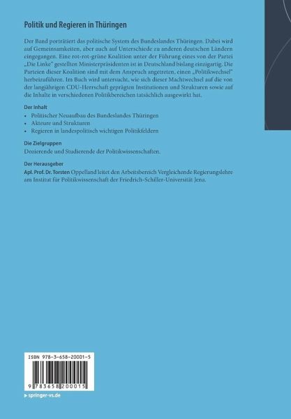 Der Band portraitiert das politische System des Bundeslandes Thüringen. Dabei wird auf Gemeinsamkeiten, aber auch auf Unterschiede zu anderen deutschen Ländern eingegangen. Eine rot-rot-grüne Koalition unter der Führung eines von der Partei "Die Linke" gestellten Ministerpräsidenten ist in Deutschland bislang einzigartig. Die Parteien dieser Koalition sind mit dem Anspruch angetreten, einen "Politikwechsel" herbeizuführen. Im Buch wird untersucht, wie sich dieser Machtwechsel auf die von der langjährigen CDU-Herrschaft geprägten Institutionen und Strukturen sowie auf die Inhalte in verschiedenen Politikbereichen tatsächlich ausgewirkt hat.