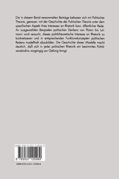 Die in diesem Band versammelten Beiträge befassen sich mit Politischer Theorie, genauer: mit der Geschichte der Politischen Theorie unter dem spezifischen Aspekt ihres Interesses an Rhetorik bzw. öffentlicher Rede. An ausgewählten Beispielen politischen Denkens von Platon bis Luhmann wird versucht, dieses politiktheoretische Interesse an Rhetorik zu konkretisieren und in entsprechenden Funktionskonzepten politischen Redens modellhaft abzubilden. Die Geschichte dieser Modelle macht deutlich, daß sich in jeder politischen Rhetorik ein bestimmtes Politikverständnis vorgängig zur Geltung bringt.