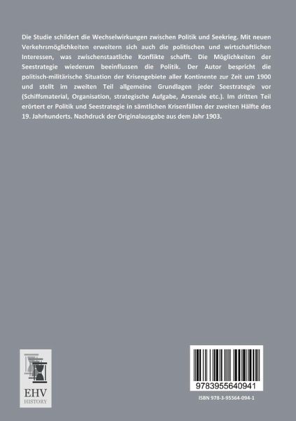 Die Studie schildert die Wechselwirkungen zwischen Politik und Seekrieg. Mit neuen Verkehrsmöglichkeiten erweitern sich auch die politischen und wirtschaftlichen Interessen, was zwischenstaatliche Konflikte schafft. Die Möglichkeiten der Seestrategie wiederum beeinflussen die Politik. Der Autor bespricht die politisch-militärische Situation der Krisengebiete aller Kontinente zur Zeit um 1900 und stellt im zweiten Teil allgemeine Grundlagen jeder Seestrategie vor (Schiffsmaterial, Organisation, strategische Aufgabe, Arsenale etc.). Im dritten Teil erörtert er Politik und Seestrategie in sämtlichen Krisenfällen der zweiten Hälfte des 19. Jahrhunderts. Nachdruck der Originalausgabe aus dem Jahr 1903.