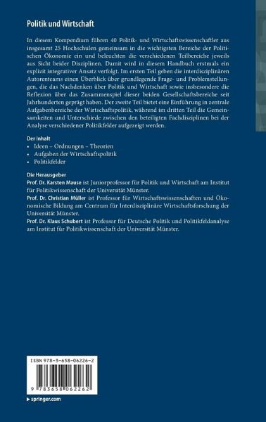 In diesem Kompendium führen 40 Politik- und Wirtschaftswissenschaftler aus insgesamt 25 Hochschulen gemeinsam in die wichtigsten Bereiche der Politischen Ökonomie ein und beleuchten die verschiedenen Teilbereiche jeweils aus Sicht beider Disziplinen. Damit wird in diesem Handbuch erstmals ein explizit integrativer Ansatz verfolgt. Im ersten Teil geben die interdisziplinären Autorenteams einen Überblick über grundlegende Frage- und Problemstellungen, die das Nachdenken über Politik und Wirtschaft sowie insbesondere die Reflexion über das Zusammenspiel dieser beiden Gesellschaftsbereiche seit Jahrhunderten geprägt haben. Der zweite Teil bietet eine Einführung in zentrale Aufgabenbereiche der Wirtschaftspolitik, während im dritten Teil die Gemeinsamkeiten und Unterschiede zwischen den beteiligten Fachdisziplinen bei der Analyse verschiedener Politikfelder aufgezeigt werden.