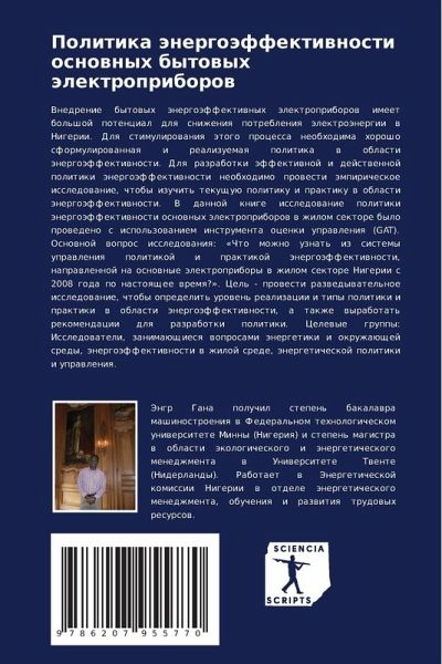 Vnedrenie bytowyh änergoäffektiwnyh älektropriborow imeet bol'shoj potencial dlq snizheniq potrebleniq älektroänergii w Nigerii. Dlq stimulirowaniq ätogo processa neobhodima horosho sformulirowannaq i realizuemaq politika w oblasti änergoäffektiwnosti. Dlq razrabotki äffektiwnoj i dejstwennoj politiki änergoäffektiwnosti neobhodimo prowesti ämpiricheskoe issledowanie, chtoby izuchit' tekuschuü politiku i praktiku w oblasti änergoäffektiwnosti. V dannoj knige issledowanie politiki änergoäffektiwnosti osnownyh älektropriborow w zhilom sektore bylo prowedeno s ispol'zowaniem instrumenta ocenki uprawleniq (GAT). Osnownoj wopros issledowaniq: «Chto mozhno uznat' iz sistemy uprawleniq politikoj i praktikoj änergoäffektiwnosti, naprawlennoj na osnownye älektropribory w zhilom sektore Nigerii s 2008 goda po nastoqschee wremq?». Cel' - prowesti razwedywatel'noe issledowanie, chtoby opredelit' urowen' realizacii i tipy politiki i praktiki w oblasti änergoäffektiwnosti, a takzhe wyrabotat' rekomendacii dlq razrabotki politiki. Celewye gruppy: Issledowateli, zanimaüschiesq woprosami änergetiki i okruzhaüschej sredy, änergoäffektiwnosti w zhiloj srede, änergeticheskoj politiki i uprawleniq.