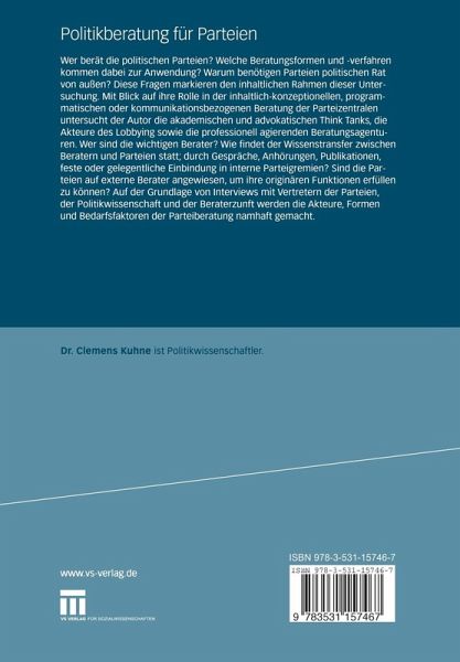 Wer berät die politischen Parteien? Welche Beratungsformen und -verfahren kommen dabei zur Anwendung? Warum benötigen Parteien politischen Rat von außen? Diese Fragen markieren den inhaltlichen Rahmen dieser Untersuchung. Mit Blick auf ihre Rolle in der inhaltlich-konzeptionellen, programmatischen oder kommunikationsbezogenen Beratung der Parteizentralen untersucht der Autor die akademischen und advokatischen Think Tanks, die Akteure des Lobbying sowie die professionell agierenden Beratungsagenturen. Wer sind die wichtigen Berater? Wie findet der Wissenstransfer zwischen Beratern und Parteien statt; durch Gespräche, Anhörungen, Publikationen, feste oder gelegentliche Einbindung in interne Parteigremien? Sind die Parteien auf externe Berater angewiesen, um ihre originären Funktionen erfüllen zu können? Auf der Grundlage von Interviews mit Vertretern der Parteien, der Politikwissenschaft und der Beraterzunft werden die Akteure, Formen und Bedarfsfaktoren der Parteiberatung namhaft gemacht.