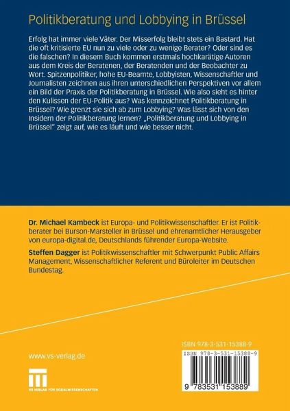 Erfolg hat immer viele Väter. Der Misserfolg bleibt stets ein Bastard. Hat die oft kritisierte EU nun zu viele oder zu wenige Berater? Oder sind es die falschen? In diesem Buch kommen erstmals hochkarätige Autoren aus dem Kreis der Beratenen, der Beratenden und der Beobachter zu Wort. Sie zeichnen aus ihren unterschiedlichen Perspektiven vor allem ein Bild der Praxis der Politikberatung in Brüssel. Wie also sieht es hinter den Kulissen der EU-Politik aus? Was kennzeichnet Politikberatung in Brüssel? Wie grenzt sie sich ab zum Lobbying? Was lässt sich von den Insidern der Politikberatung lernen? "Politikberatung in Brüssel" zeigt auf, wie es läuft und wie besser nicht.