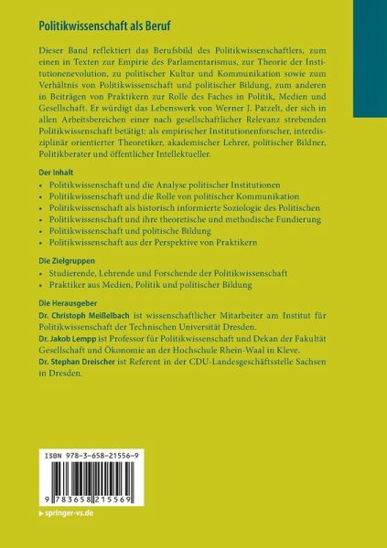 Dieses Buch würdigt das Lebenswerk von Werner J. Patzelt, der in der Ausübung seines Berufs die in seiner populären "Einführung in die Politikwissenschaft" umrissenen Wirkungsbereiche einer nach gesellschaftlicher Relevanz strebenden Politikwissenschaft immer faktisch ausgefüllt hat: als empirischer Institutionenforscher, interdisziplinär orientierter Theoretiker, akademischer Lehrer, politischer Bildner, Politikberater und öffentlicher Intellektueller in gesellschaftlichen Diskursen. Diese Festschrift zu seinem 65. Geburtstag reflektiert dieses facettenreiche Berufsbild des Politikwissenschaftlers aus verschiedenen Perspektiven. Der Band enthält akademische Texte zum Empirie des demokratischen Parlamentarismus, zur Theorie der Institutionenevolution, zur politischen Kultur und Kommunikation und zum Verhältnis von Politikwissenschaft und politischer Bildung ebenso wie Beiträge von Praktikern zur Rolle des Faches in Politik, Medien und Zivilgesellschaft.