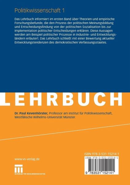 Das Lehrbuch informiert im ersten Band über Theorien und empirische Forschungsbefunde, dieden Prozess der politischen Meinungsbildung und Entscheidungsfindung von der politischen Sozialisation bis zur Implementation politischer Entscheidungen erklären. Diese Aussagen werden am Beispiel politischer Prozesse in Industrie- und Entwicklungsländern erläutert. Das Lehrbuch schließt mit einer Bewertung aktueller Entwicklungstendenzen des demokratischen Verfassungsstaates.