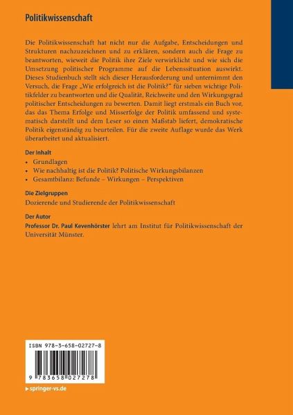 Die Politikwissenschaft hat nicht nur die Aufgabe, Entscheidungen und Strukturen nachzuzeichnen und zu erklären, sondern auch die Frage zu beantworten, wieweit die Politik ihre Ziele verwirklicht und wie sich die Umsetzung politischer Programme auf die Lebenssituation auswirkt. Dieses Studienbuch stellt sich dieser Herausforderung und unternimmt den Versuch, die Frage "Wie erfolgreich ist die Politik?" für sieben wichtige Politikfelder zu beantworten und die Qualität, Reichweite und den Wirkungsgrad politischer Entscheidungen zu bewerten. Damit liegt erstmals ein Buch vor, das das Thema Erfolge und Misserfolge der Politik umfassend und systematisch darstellt und dem Leser so einen Maßstab liefert, demokratische Politik eigenständig zu beurteilen. Für die zweite Auflage wurde das Werk überarbeitet und aktualisiert.