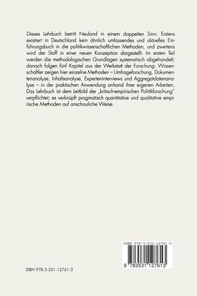 Dieses Lehrbuch betritt Neuland in einem doppelten Sinn: Erstens existiert in Deutschland kein ähnlich umfassendes und aktuelles Einführungsbuch in die politikwissenschaftlichen Methoden, und zweitens wird der Stoff in einer neuen Konzeption dargestellt. Im ersten Teil werden die methodologischen Grundlagen systematisch abgehandelt, danach folgen fünf Kapitel aus der Werkstatt der Forschung: Wissenschaftler zeigen hier einzelne Methoden - Umfrageforschung, Dokumentenanalyse, Inhaltsanalyse, Experteninterviews und Aggregatdatenanalyse - in der praktischen Anwendung anhand ihrer eigenen Arbeiten. Das Lehrbuch ist dem Leitbild der "kritisch-empirischen Politikforschung" verpflichtet, es verknüpft pragmatisch quantitative und qualitative empirische Methoden auf anschauliche Weise.