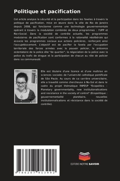 Cet article analyse la sécurité et la participation dans les favelas à travers la politique de pacification, mise en oeuvre dans la ville de Rio de Janeiro depuis 2008, qui fonctionne comme une technologie gouvernementale opérant à travers la modulation combinée de deux programmes : l'UPP et Rio+Social. Dans la société de contrôle actuelle, les programmes modulaires de pacification sont conformes à la rationalité néolibérale qui associe les programmes sociaux aux actions policières, renforçant ainsi l'assujettissement. L'objectif est de pacifier la favela par l'occupation territoriale des forces armées avec le pouvoir policier, la présence ostentatoire de la police dite "de quartier", la négociation de la police avec la police du trafic de drogue et la participation de chacun au rôle de policier dans sa communauté.