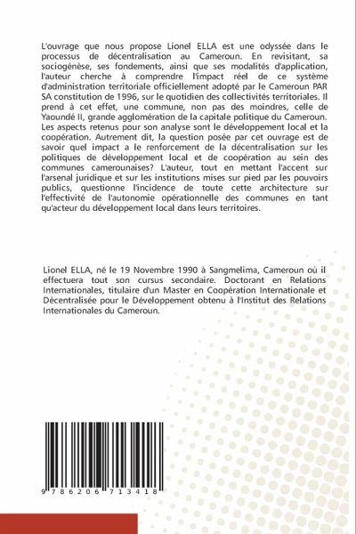 L'ouvrage que nous propose Lionel ELLA est une odyssée dans le processus de décentralisation au Cameroun. En revisitant, sa sociogénèse, ses fondements, ainsi que ses modalités d'application, l'auteur cherche à comprendre l'impact réel de ce système d'administration territoriale officiellement adopté par le Cameroun PAR SA constitution de 1996, sur le quotidien des collectivités territoriales. Il prend à cet effet, une commune, non pas des moindres, celle de Yaoundé II, grande agglomération de la capitale politique du Cameroun. Les aspects retenus pour son analyse sont le développement local et la coopération. Autrement dit, la question posée par cet ouvrage est de savoir quel impact a le renforcement de la décentralisation sur les politiques de développement local et de coopération au sein des communes camerounaises? L'auteur, tout en mettant l'accent sur l'arsenal juridique et sur les institutions mises sur pied par les pouvoirs publics, questionne l'incidence de toute cette architecture sur l'effectivité de l'autonomie opérationnelle des communes en tant qu'acteur du développement local dans leurs territoires.