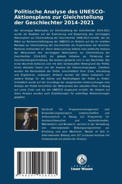 Der vorrangige Aktionsplan zur Gleichstellung der Geschlechter 2014-2021 wurde als Reaktion auf die Evaluierung und Bewertung des vorrangigen Aktionsplans zur Gleichstellung der Geschlechter 2008-2013 erstellt, der als Mittel zur Rechenschaftslegung der UNESCO im Hinblick auf die ihr erteilten Mandate zur Gleichstellung der Geschlechter als Organisation der Vereinten Nationen entstanden ist. Diese Untersuchung lieferte eine politische Analyse der Wirksamkeit des vorrangigen Aktionsplans zur Gleichstellung der Geschlechter 2014-2021 als globale Initiative zur Förderung der Geschlechtergleichstellung. Die Analyse gliederte sich in vier Abschnitte. Der erste Abschnitt befasste sich mit dem kontextuellen Hintergrund der Politik, ihrem aktuellen Stand und der Analyse der Interessengruppen. Zweitens wurden die Bestandteile der Politik, einschließlich ihrer Ziele, Umsetzung und Ergebnisse, analysiert. Drittens wurden die Daten analysiert, um weitere Belege für die Stärke und Nachhaltigkeit der Politik zu finden. Schließlich wurde auf der Grundlage der vorgenannten Untersuchungen eine Analyse der Politik hinsichtlich der Wirksamkeit des aktuellen Plans in Bezug auf seine Ziele und die der UNESCO insgesamt erstellt. Als Antwort auf diese Analyse wurden auch Empfehlungen für zukünftige Verbesserungen gegeben.