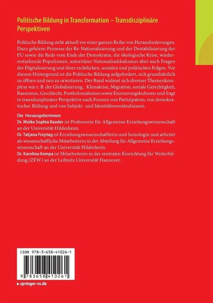 Geschichte der Politischen Bildung.- Das Politische feministisch gedacht.- Autorität, autoritäre Systeme, Autorotarismus und Populismu.- Wohin wollen wir bilden? Wie politisch darf es sein?- Politische Bildung aus queerer Perspektive.- Rassismuskritik in der Politischen Bildung.- Bildung, Demokratie und Menschenrechte.- Inclusive Citizenship Education: Politische Bildung in der Migrationsgesellschaft.